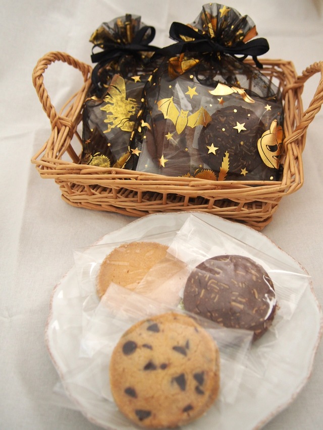 巾着サイズ15×21cmマチなし 黒のオーガンジー素材の巾着にハロウィンの柄が金箔で入っていてとってもおしゃれ♪ チョコチップクッキー ショコラアマンドクッキー プレーンクッキー 各1枚計3枚いり。 お渡し用の袋が必要な方は備考欄にその旨をご記入おねがいします。 ☆保存方法 高温多湿を避け冷暗所で保管してください。 夏季は冷蔵庫での保存をお勧めします。 ☆賞味期限 発送より14日間 ☆特定原材料 卵 小麦粉 乳 卵、小麦粉、乳製品、ナッツを使用した製品を同じ工場で製造しております。 ☆夏季(6月~9月)はクール便での配送となります。!!