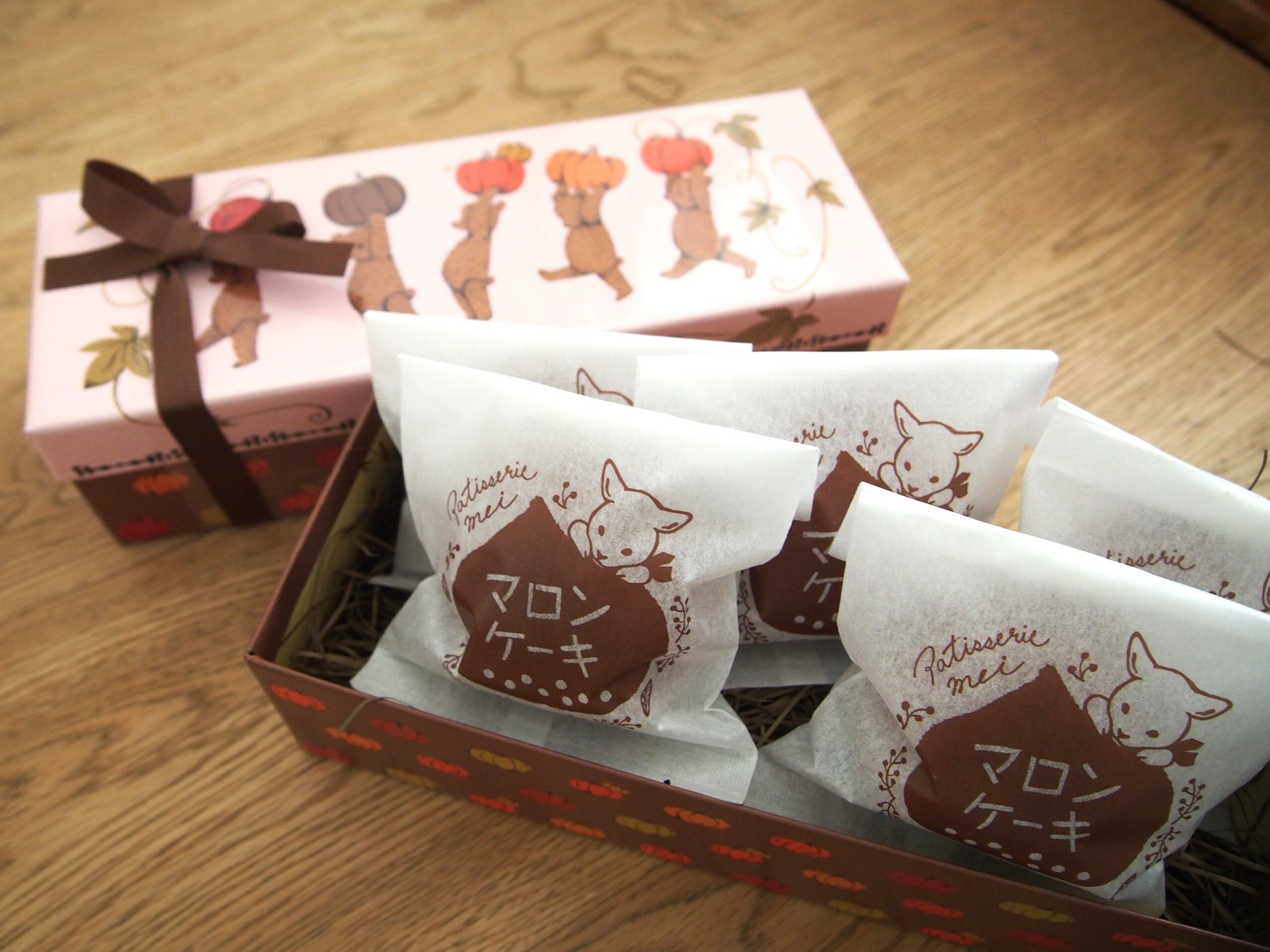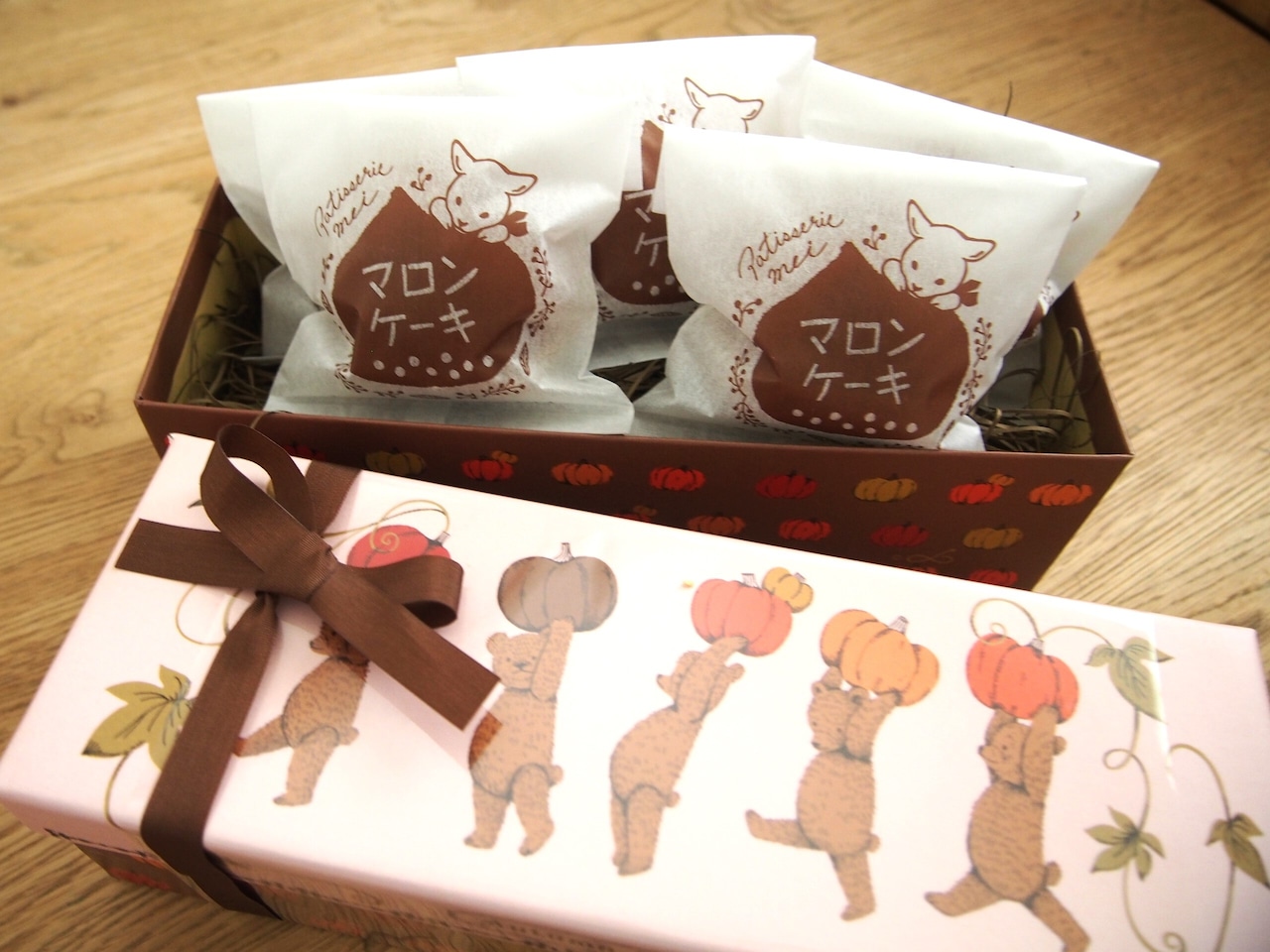 秋に人気のマロンケーキが可愛らしい貼り箱に入った秋のギフトボックスです。